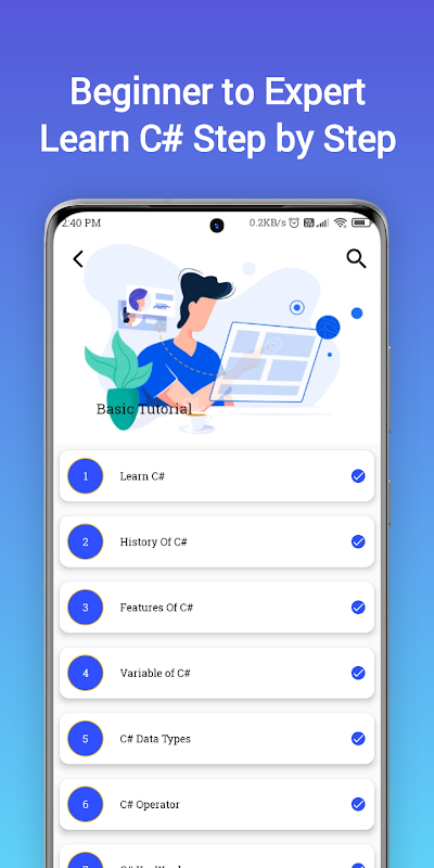 Learn C#のユーザーインターフェイスは非常にシンプルです。これは、C#プログラミング言語を無料で習得できる最高のアプリです。今すぐアプリをダウンロードして、Learn C#になります。