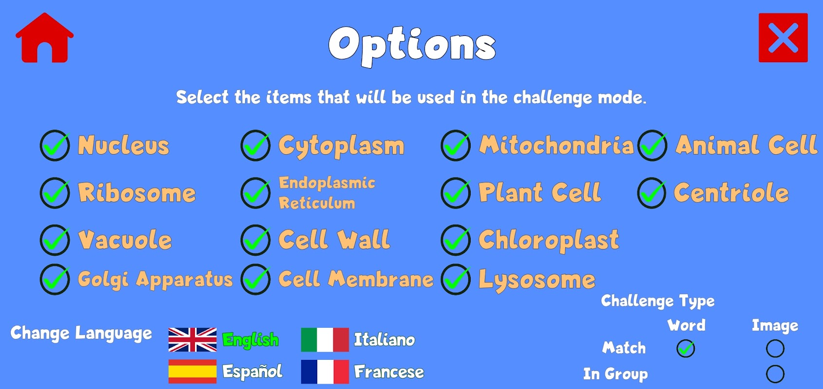 - 画像マッチ - 単語のスペルを音声と映像で確認し、細胞画像の正しい部分と一致させます。