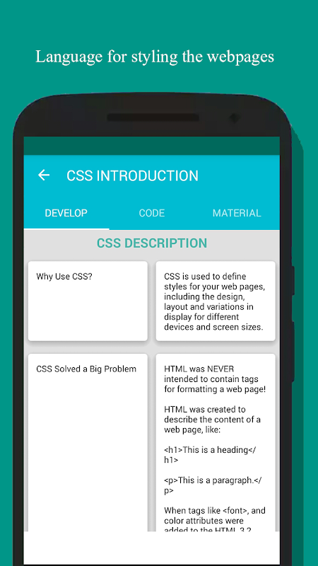 This Application will teach you about CSS in detail with it's Properties and you can easily see the Properties Output at a time with it's code.