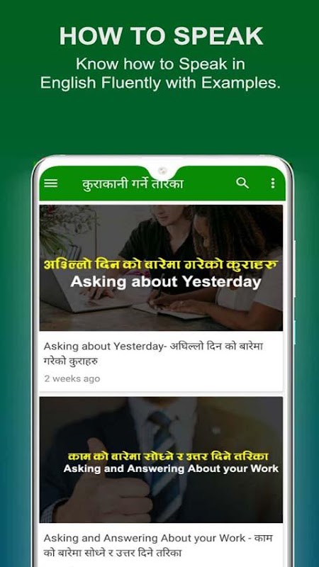 すべての有用な語彙と人気のある一般的な表現でネパール語から英語を学ぶための最良の方法。ほんの数時間で英語を話せるようになりましょう。このアプリは、英語とネパール語でのコミュニケーションスキルを向上させるのに役立ちます。すべての単語と文は英語とネパール語の両方に翻訳されており、習得と学習が簡単です。