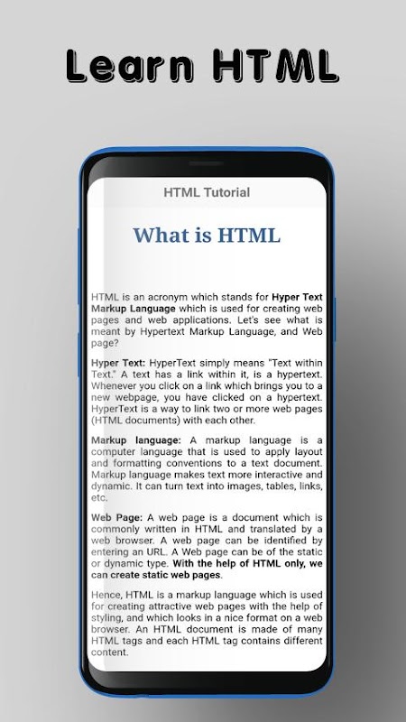 "Learn HTML - HTML Tutorial" is best application in play store for easily learn HTML concept for developers.If you are already familiar with CSS, and JavaScript, you can dive right in!