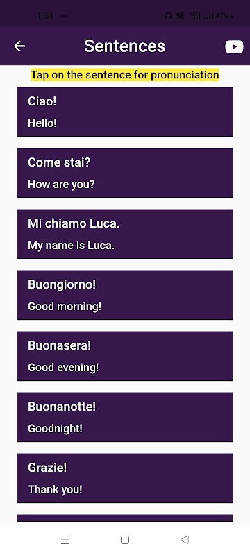 4. 発音ガイド: 効果的なコミュニケーションには正しい発音が不可欠です。私たちのアプリはイタリア語のネイティブスピーカーの音声録音を提供しており、単語やフレーズの正しい発音を聞いて練習することができます。内蔵の音声認識機能を使用すると、自分の発音をネイティブスピーカーの発音と比較できます。