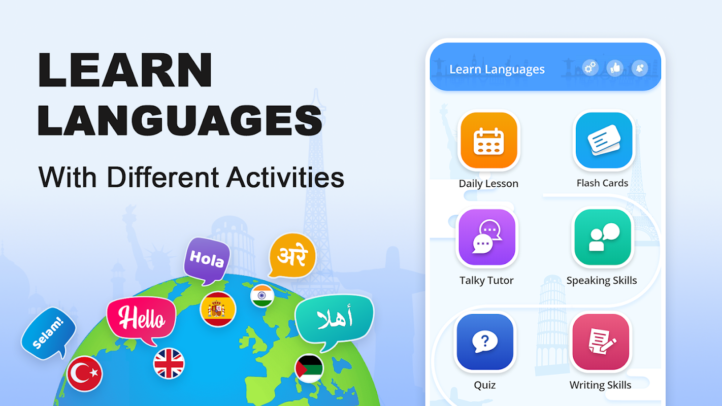 今ではスペイン語、フランス語、トルコ語、アラビア語、ヒンディー語を学ぶのは楽しいです。これらすべての最も話されている言語を学ぶは、リストから新しい言語を簡単かつ効果的に学ぶことができる素晴らしい言語学習アプリです。言語を学ぶ無料アプリはあなたのためにこれらすべての有名な言語を学ぶことをより簡単にします。あなたの母国語だけを知っていることを心配する必要はありません、言語学習アプリはあなたの人生をはるかに楽にするためにここにあります。毎日のレッスン、会話の練習、フラッシュカードのアクティビティなど、さまざまなアクティビティを探索して言語を学び、スキルを向上させます。語彙ビルダーアプリは、初心者や新しい言語を学びたい人のためのものです。あなたがあなたのポケットの中にあなた自身の家庭教師を持っていると感じるので、語学学習アプリは素晴らしい働きをします。
