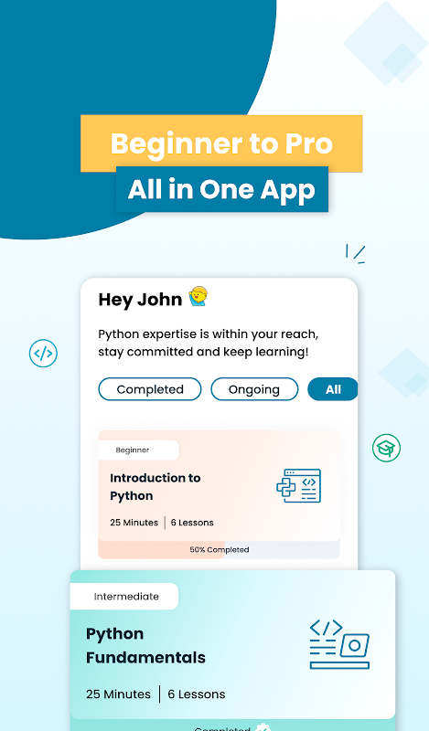 このPython学習アプリを使えば、ゼロから始めて、直感的でインタラクティブな体験でコーディングを学ぶことができます。初心者の方でも、既にPythonコーディングに精通している方でも、体系化されたカリキュラムがスキルを次のレベルに引き上げるように設計されています。Pythonプログラミングの技術を習得し、実用的なアプリケーションを作成し、世界で最も需要の高いプログラミング言語の一つであるPythonで、業界で即戦力となるスキルを身につけましょう。