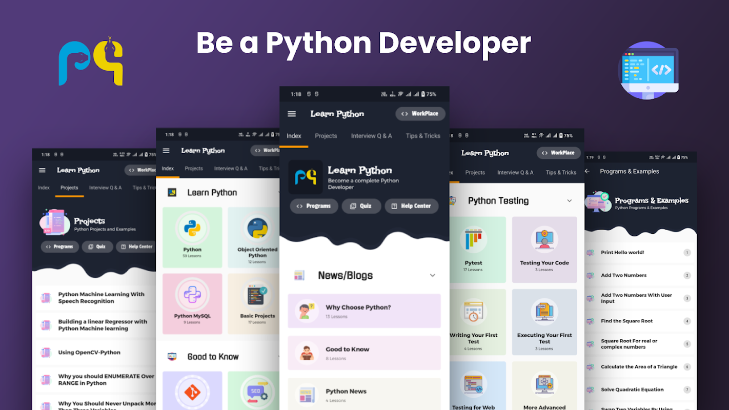 私たちのPythonプログラミング学習アプリは、Pythonプログラミング言語を学び、この言語での仕事のインタビューをクラックするための強力な基礎を構築したいすべての初心者およびエキスパートレベルのプログラマーに最適な学習資料を提供します。