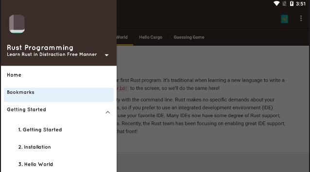 オフラインレッスン、トリビア、コンパイラ、メモ、ブックマークなどを利用して、どこからでも Rust を学習し、コーディングできます。