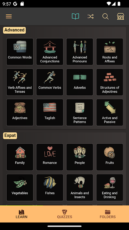 タガログ語の接辞、名詞、動詞、副詞、形容詞などを理解することで、基本的および高度なタガログ語文を構築する方法を学びます。自分で文章を作るためにタガログ語の文法を学びましょう。このアプリの構造は、挨拶の前にタガログ語の単語をいくつか教えてから、文法に進みます。