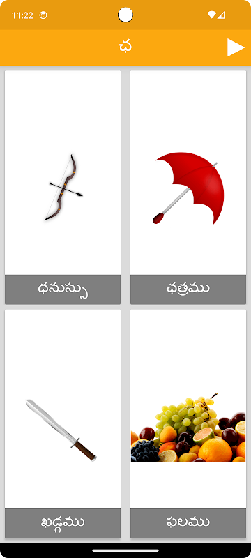 フリップカードインターフェースで、テルグ語の文字を明確かつ体系的に学習できます。