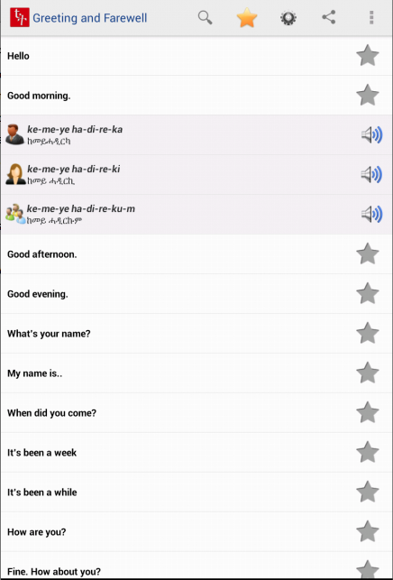 Have you ever wondered to learn Tigirigna language but not know where to start? Have you traveled to north Ethiopia and find it difficult to relate to locals? Look no more! This app includes all the important words and phrases to get you started in the exciting language of Tigrigna.