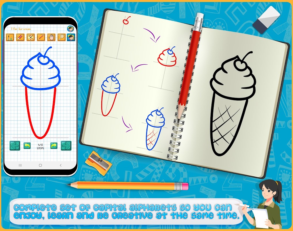 Not planning on drawing in the app? No problem, each alphabet sketch tutorial is divided into 4-6 easy steps, Follow those steps and you can draw beautiful sketches on a piece of paper or in your drawing art book.