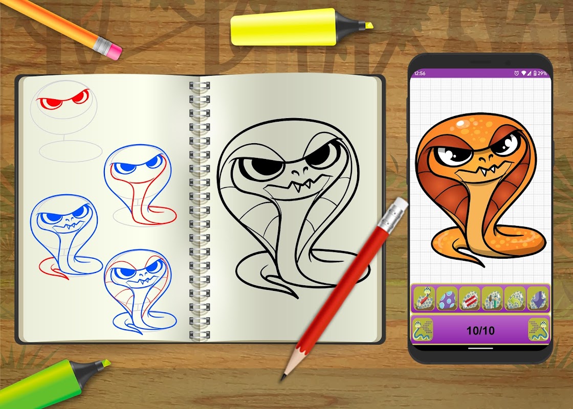 Learn how to draw cute chibi snakes is an app that provides a large collection of snake drawings including: Learn to draw King Cobra, Draw Cobra snake, how to draw Realistic Snake, how to draw cute baby snakes, snake drawing tutorial for beginners, Learn to draw snake head tattoo, Tribal Snake, Cartoon Snake, Snake Tattoo, Draw Snake Heads, Anaconda, Snake Love, Black Mamba, Viper and many more easy snake drawing tutorials.