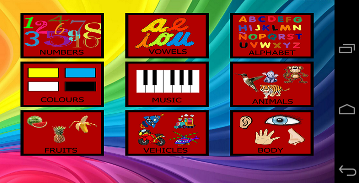 This application is primarily intended for learning the alphabet, numbers, colors, animals, music, clothes and reading for very young children.