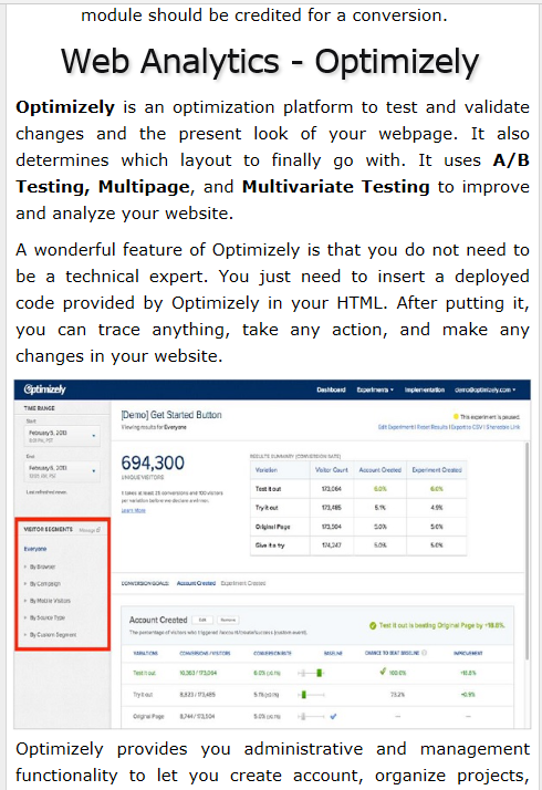 "Web Analytics Quick Guide - Learn Web Analytics in simple and easy steps starting from basic to advanced concepts with examples including Introduction, Google Analytics, Optimizely, Kissmetrics, Crazy Egg, Key Metrics, Data Sources, Segmentation, Dashboards, Conversion, Emerging Analytics, A/B Testing, Automated Reporting and Annotation, Actionable Reporting, Analytics Terminology.