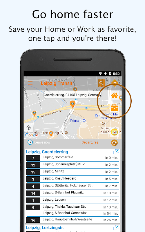 自宅や職場への専用ショートカットボタンを使用して、推定時間と遅延を1回タップするだけで目的地までの公共交通機関のルートを取得できます。地図上の現在の場所を選択し、1つのステップで自宅または職場として設定します。簡単だ!