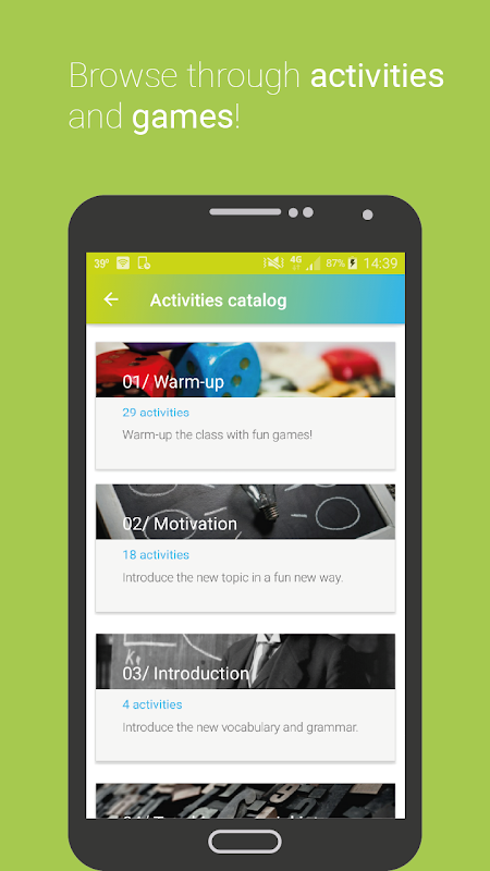 教師のための最良の援助 - 新しいESLのウォームアップ、ゲームや他のレッスン活動を探して時間を費やすことはありません!内蔵の活動カタログを使用すると、すべての活動をナビゲートし、あなたのレッスンを含むために新鮮なアイデアを得ることができます。