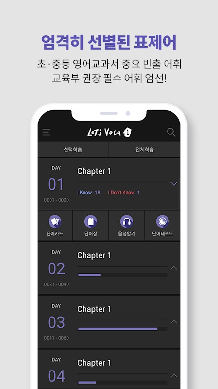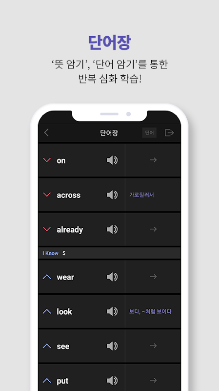 2.単語帳:単語カードの学習結果に基づいて「I do not Know」と「I Know」で区切られた単語の深化学習が可能です。単語を見て意味を暗記したり、意味を見て単語を暗記することができます。