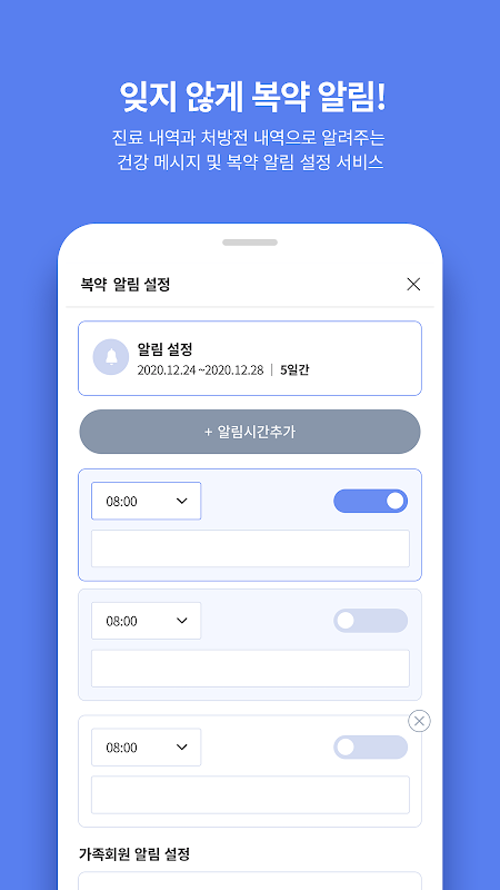 자가건강측정, 개인건강기록 관리, 건강데이터를 활용한 지능형 건강분석 서비스 및 복약 알림 서비스를 제공합니다.