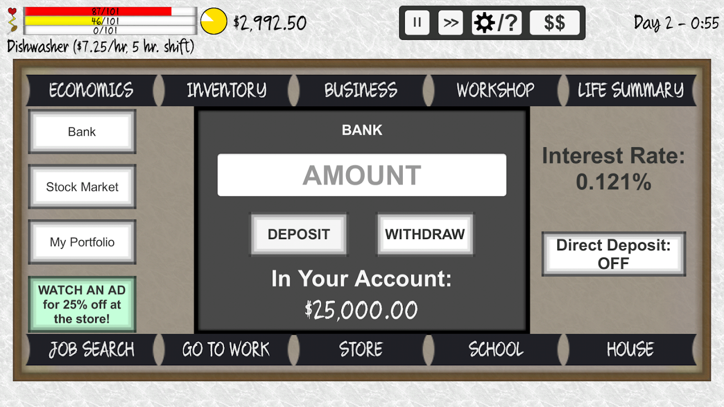 素晴らしい仕事をゲット!株式市場をプレイ!ビジネスを開始!学校に行く!