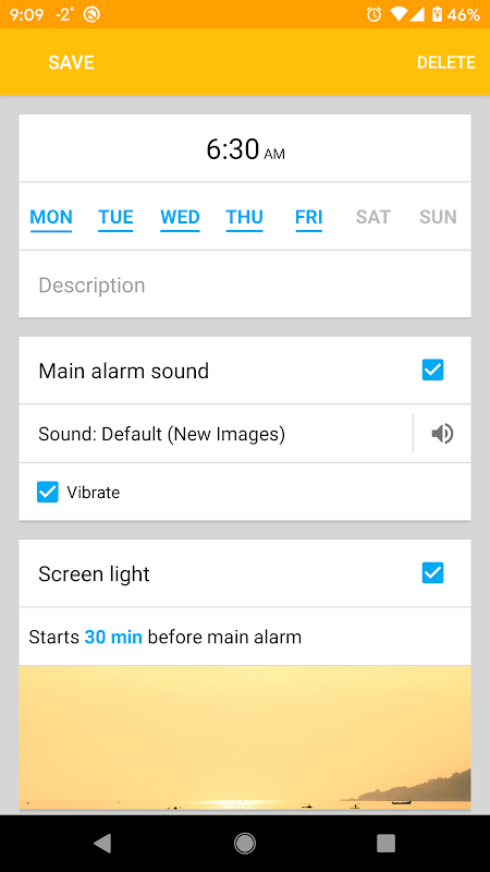バッテリーレベルがアプリの設定で指定されているよりも低い場合、アラーム前の音とスクリーンライトはメインアラーム時間までオンになりません。設定でこの動作を無効にすることができます。