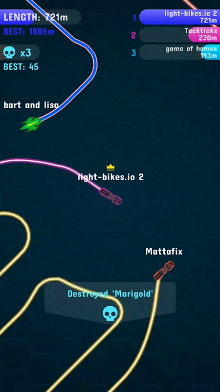 Jump onto your bike, and race your rider across cyberspace in this unique .io game! Leave a light trail behind you and destroy all your opponents. Watch out though, others riders will be actively trying to destroy you with their light trail as well!