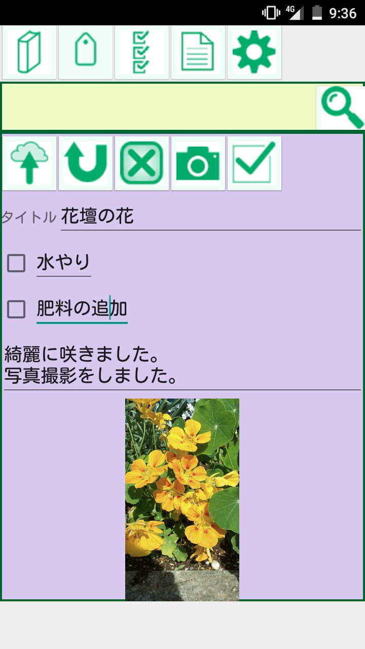 ノートの作成は、フリーテキストの他に、写真の添付(1枚)、Todoの追加ができます。