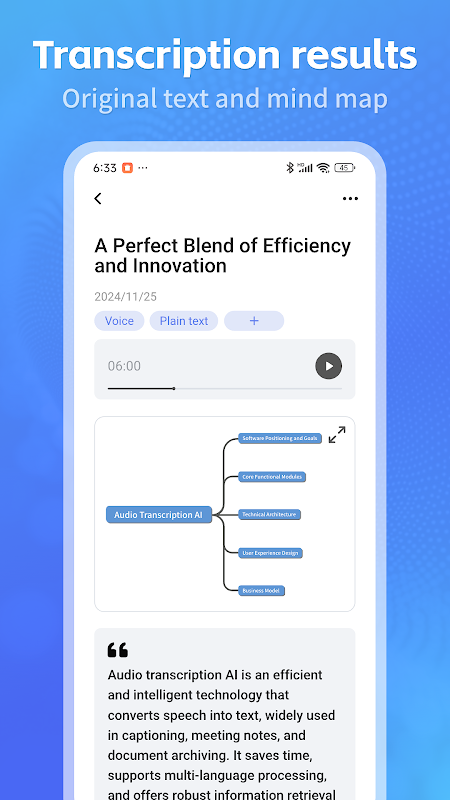 録音後、LimeVoice は音声を自動的にテキストに変換し、深層学習アルゴリズムを使用して簡潔な要約を生成します。独自のテキスト処理エンジンは、重要なポイントを視覚化するためのマインド マップも作成し、会議のメモや学習効率を向上させます。