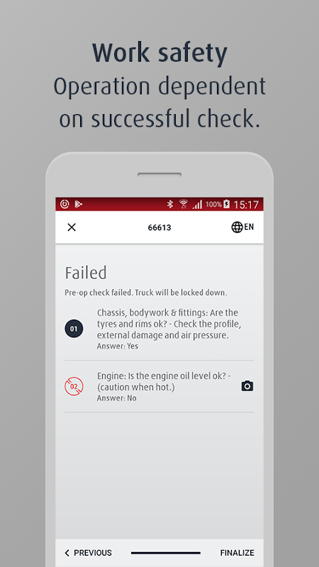A digital checklist is used to record and document the condition of trucks prior to starting work. The employee answers the questions with either ‘YES’ or ‘NO’. Depending on the answer given, the employee then moves on to the next question, is required to submit a photo, or the truck is shut down. Test results are transmitted digitally, which cuts down on paperwork and makes archiving simpler.