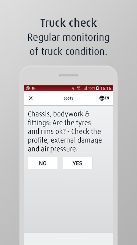 The truck is connected to the app via NFC. The truck can only be started once the visual inspection of it has shown there to be no serious faults.