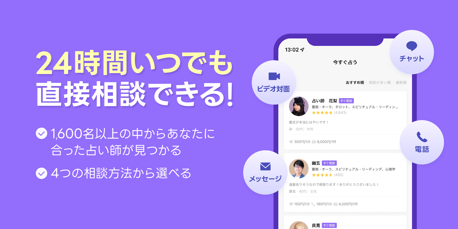 ビデオ対面、チャット、電話、メッセージの4つの手段で相談できる占い師に出会えます!