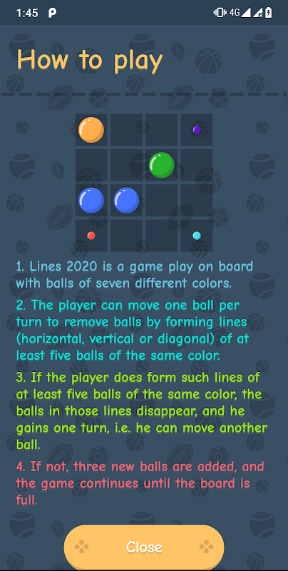 The player can move one ball per turn to remove balls by forming lines (horizontal, vertical or diagonal) of at least five balls of the same color.