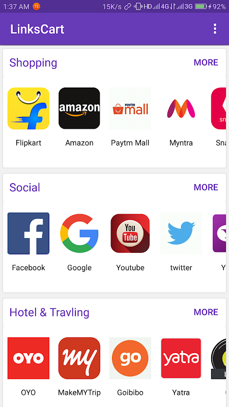 LinksCart is simple and very small size app. This App is easy to use. you can find many shopping site, banking site, study site, Recharge site, social site and much more in this single app. I hope you will enjoy this app. if you like our app than please gives your rating and share to all your knowns.