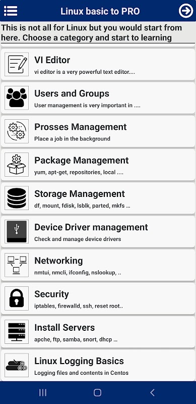 このアプリケーションは、Linux を学びたい人向けに作成されています。このアプリとこのクラスの他のアプリの主な違いは、すべてのコマンドとツールが GIF アニメーションで説明されていることです。したがって、どのコマンドがどの結果を生成するかを確認できます。そして、私はすべてを簡単でシンプルな言葉で説明しようとしました.