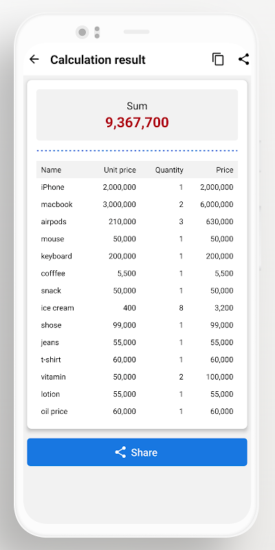 • 名前、単価、数量を入力すると、価格が簡単に計算されます。