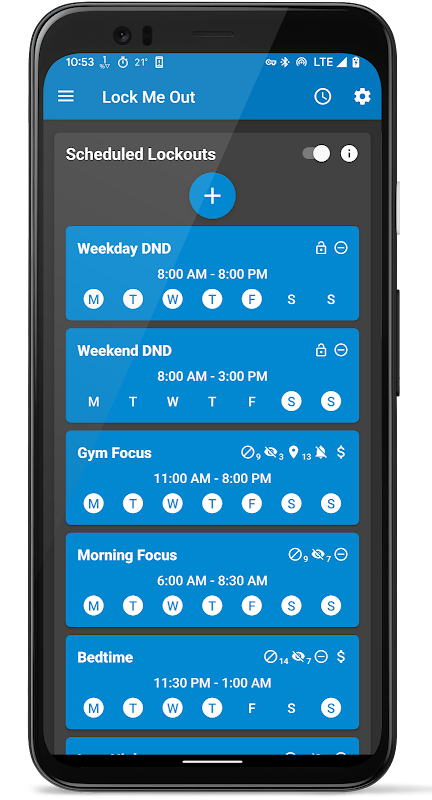 今だけのために素早くワンタイムロックアウトを開始します。カスタムの動作時間や特定の時刻までのロック設定、または後でロックアウトのスケジューリングができます。