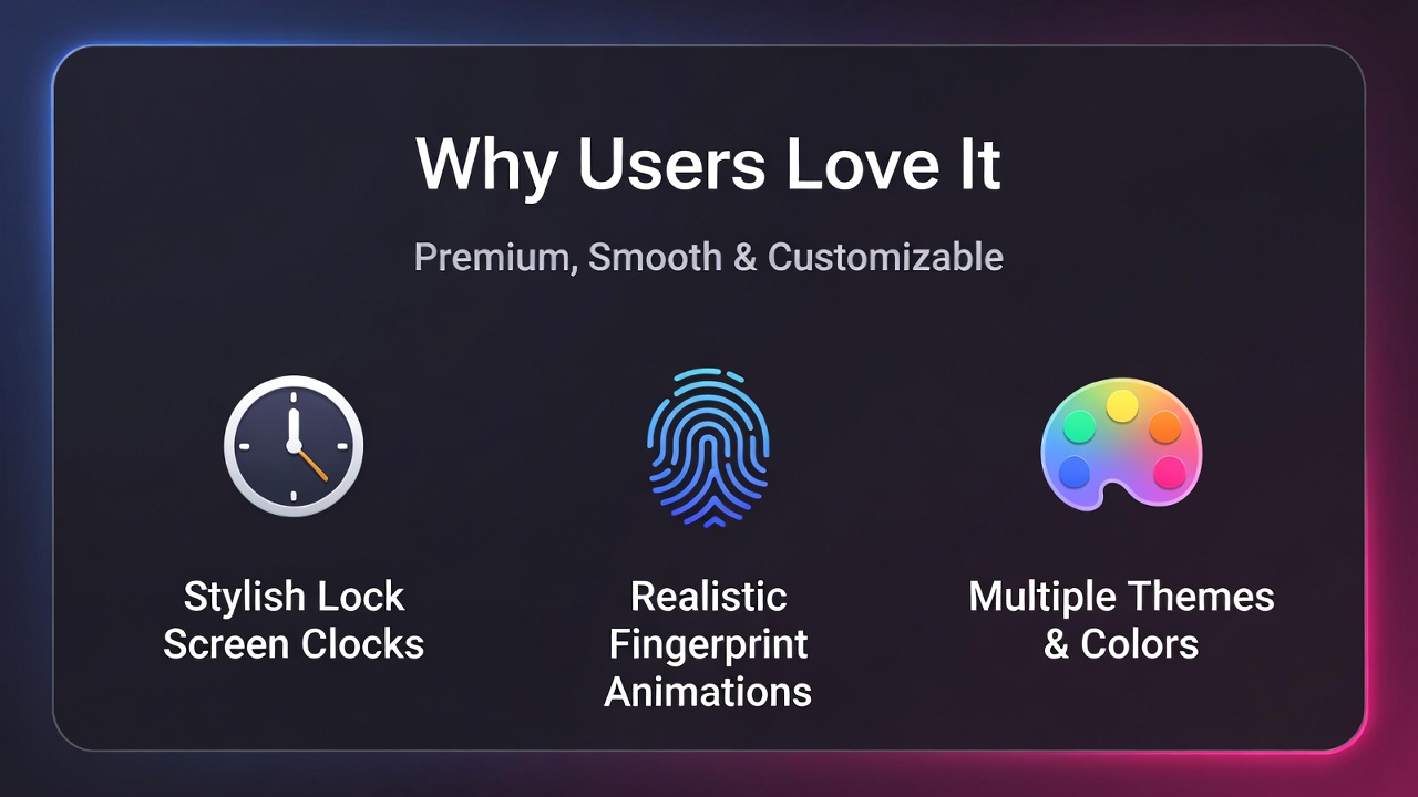 未来的で高級感のある、滑らかでリアルな指紋スキャンアニメーションでスマートフォンのロックを解除できます。色、スタイル、エフェクトを自分好みにカスタマイズできます。軽量、高速、そしてバッテリー消費も抑えたデザインで、パフォーマンスを犠牲にすることなく、個性的で目を引くロック画面を求めるユーザーに最適です。