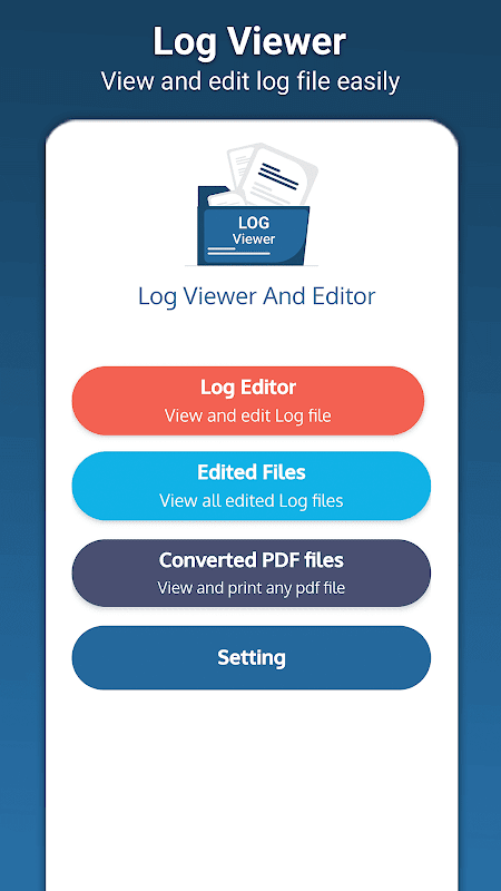 Log Reader allow you to read, save, and convert log to pdf. It includes features like to pick a pdf file from device, share a pdf file, PDF viewer, print pdf files. Log file opener easily convert your log to pdf file easily with a single tap. You can also use Log Reader to view your logs offline.