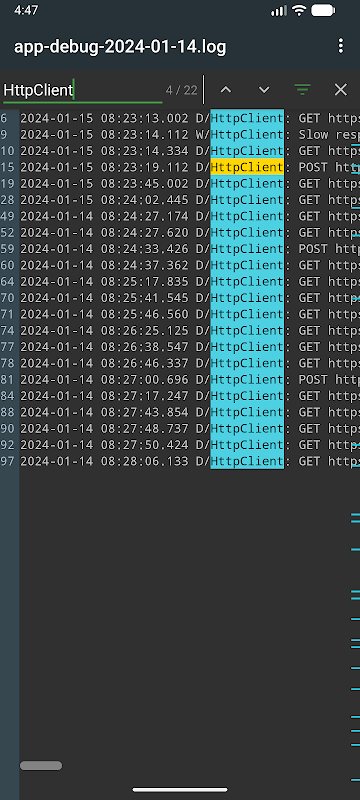 色分けされたレベル、全文検索、高速スクロールを使用してログ ファイルを表示します。