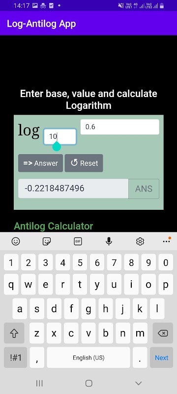 逆対数を変換するには、逆対数の底を入力するだけです。デフォルトでは、底は 10 です。底を選択したら、値を入力して、逆対数を計算するボタンをタップするだけです。