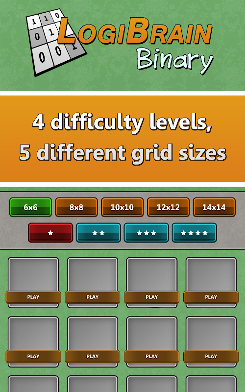 LogiBrain Binaryには、様々なサイズと難易度の2000以上のパズルが含まれています。簡単(1つ星)、普通(2つ星)、難しい(3つ星)、非常に難しい(4つ星)です。