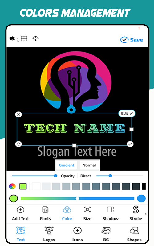 Logo Makerは、フリップ、回転、3D回転、サイズ変更、曲線、フォント、色、色相など、美しいオリジナルのロゴを作成するために必要なプロの写真編集およびテキスト編集ツールも提供します。