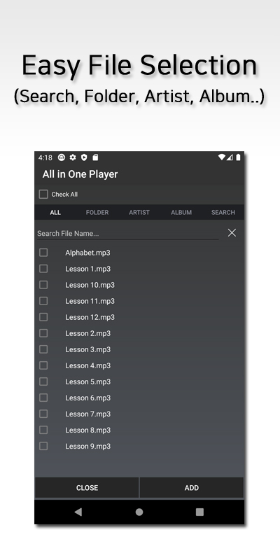 すべて、フォルダ、アーティスト、アルバムごとにオーディオファイルを簡単に見つけることができます。必要に応じて、手動検索でSDカードなどの外部ストレージからファイルを見つけることができます