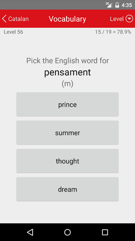 •語彙:200レベル、カタロニア語と英語の間に10の単語の翻訳をテストする各。これらの間に散在(226レベルの合計を与える)以前に学習したものを見直し累積レベルです。