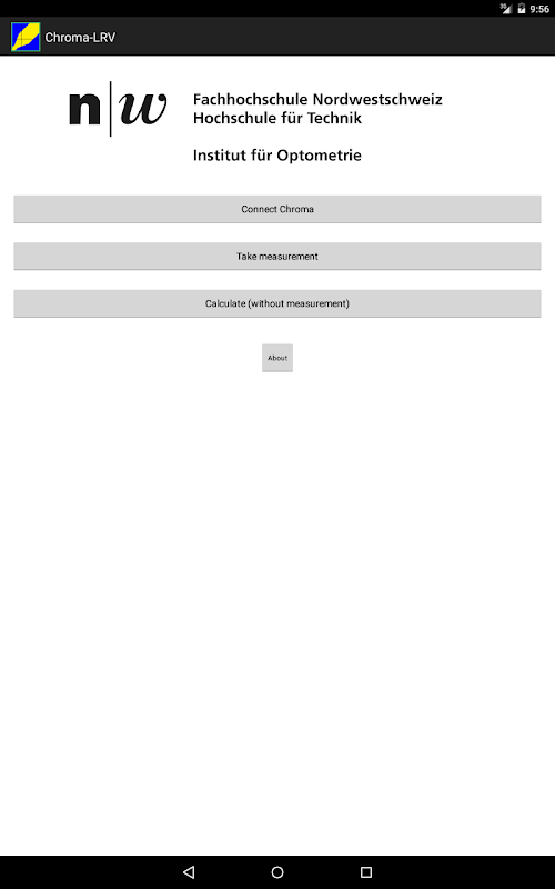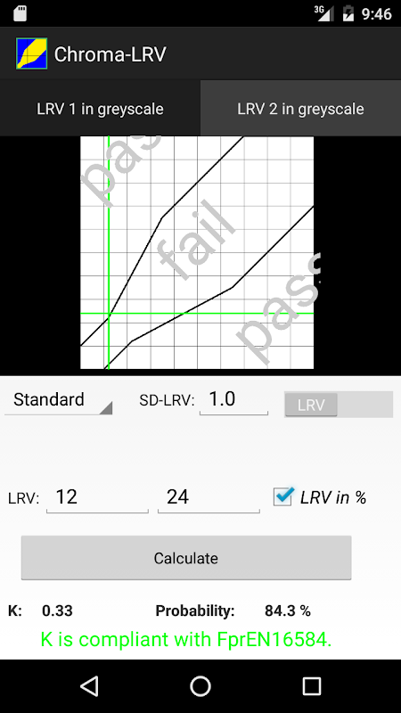 このAndroidのアプリケーションは、コンセプトの証明として、ベータ版です。 2015:それはFprEN 16584から1に従って2 LRVs(光反射率)との差を評価します。 LRV測定はノード+彩度を用いて実施されます。マイケルソンコントラストは標準偏差を考慮に入れていることによりLRVsから得られます。 2015グラフで表示されます。したがって、パスが/基準とFprEN 16584から1の履行のための確率は失敗します。 LRVまたはL * AB値は、直接(ノード+彩度を使用せずに)入力することができます。いいえ保証は、本ソフトウェアの使用のために与えられていないことができ、それが唯一のユーザー自身の責任において適用することができます。