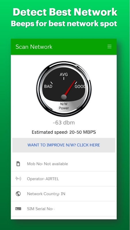 With the help of Network Detector app, you can find out the best network by roaming around the windows, balcony or outdoor spot even inside a room. App beeps when network power can offer you more than 500kbps -1mbps speed. Beep tone increases as network power increases. 3dbm rise in network means double of the network power. Just by finding optimum spot, you can increase your data speed by 20-30%.