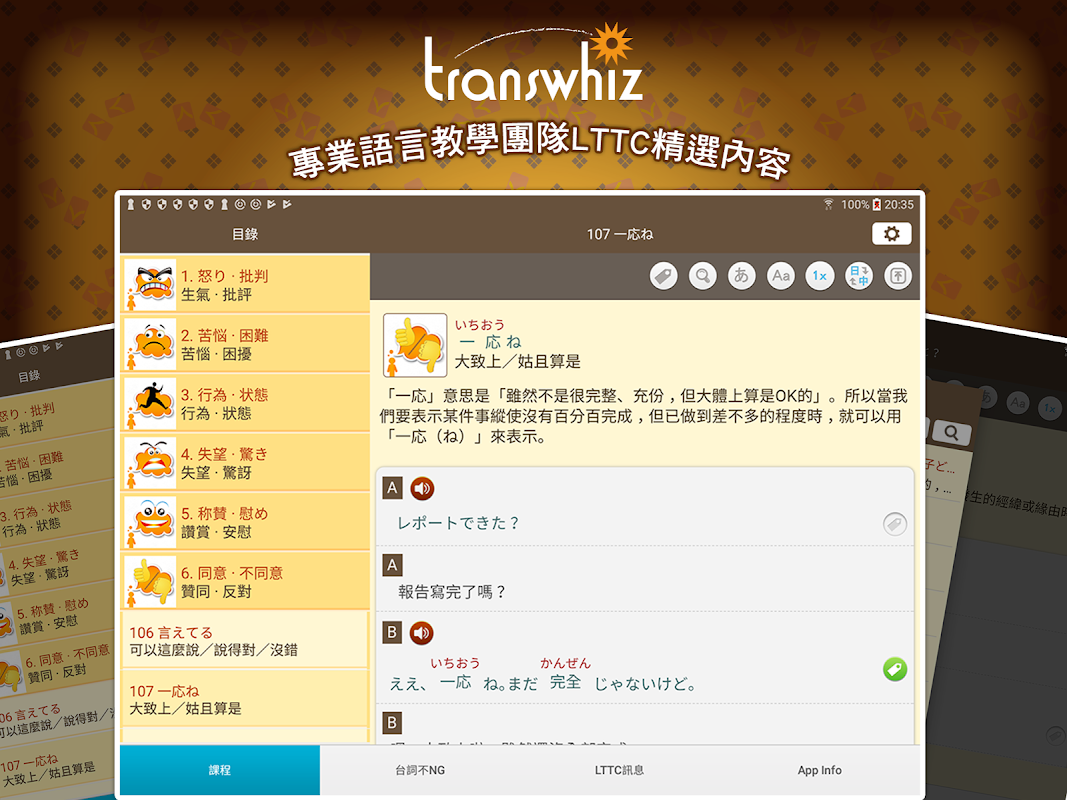 背了單詞,也學了日語句型,但就是無法說一口流利的日語。使用本套產品,您的問題可迎刃而解,輕鬆開口說道地的日語並非難事!本 app 內容由 LTTC 語言訓練測驗中心授權 Transwhiz 製作發行,品質保證,物超所值!