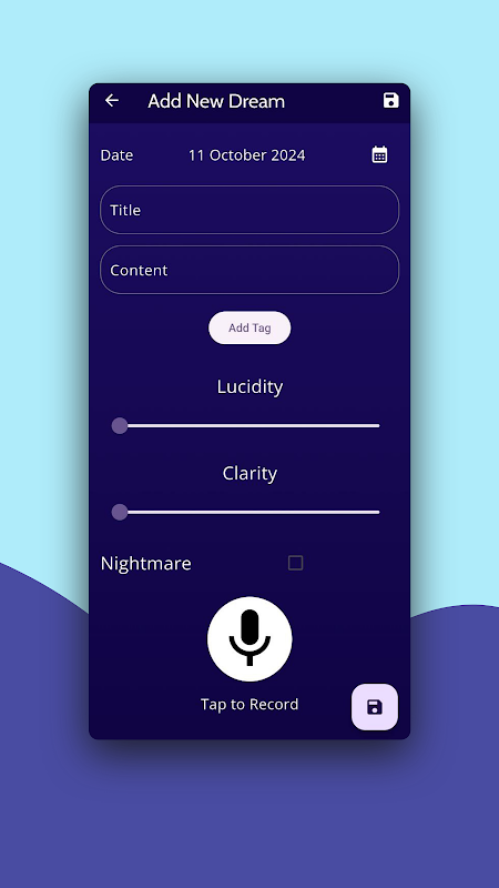 タイトル、日付、時刻、内容、タグ、明晰さ、明確さ、悪夢かどうかのフィールドを使用して、夢のあらゆる側面をキャプチャします。さらに、タグを使用してエントリをカスタマイズしたり、それぞれの夢の明瞭さを評価したりすることもできます。