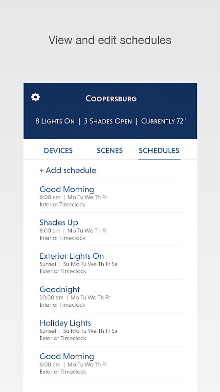 その日の設定した時刻に自動的に発生するシーンをスケジュール、または日の出と日没に基づきます。 、夕暮れ時にあなたのポーチライトをオンに夜明けにそれをオフにし、または日で目を覚ますために午前中にあなたの色合いを開きます。