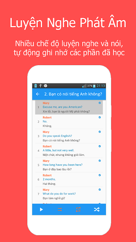「Luyện nghe tiếng anh giao tiếp cơ bản」là phần mềm giúp rèn luyện kỹ năng nghe một cách hoàn thiện hơn。 Phần mềm học tiếng Anh tốt nhất trên Android, có đầy đủ những đoạn hội thoại từ cơ bản đến nâng có, có phat âm, có b ản dịch đầy đủ。 Có thể sử dụng mà không cần kết noối mạng。