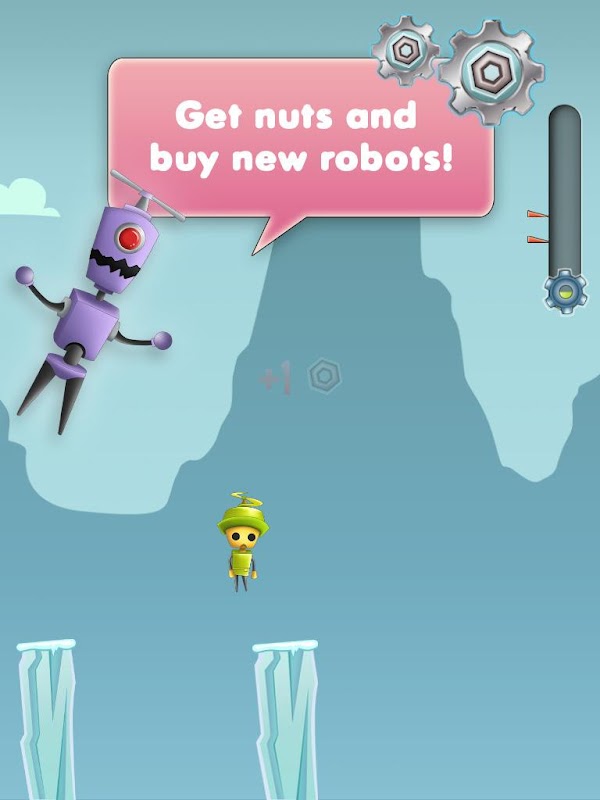 Try to tap at the right moment to reach another platform. Too much or too little amount of fuel will lead to falling. Collect the nuts to get new fancy robots. Perform perfect jumps and get all robots you can.