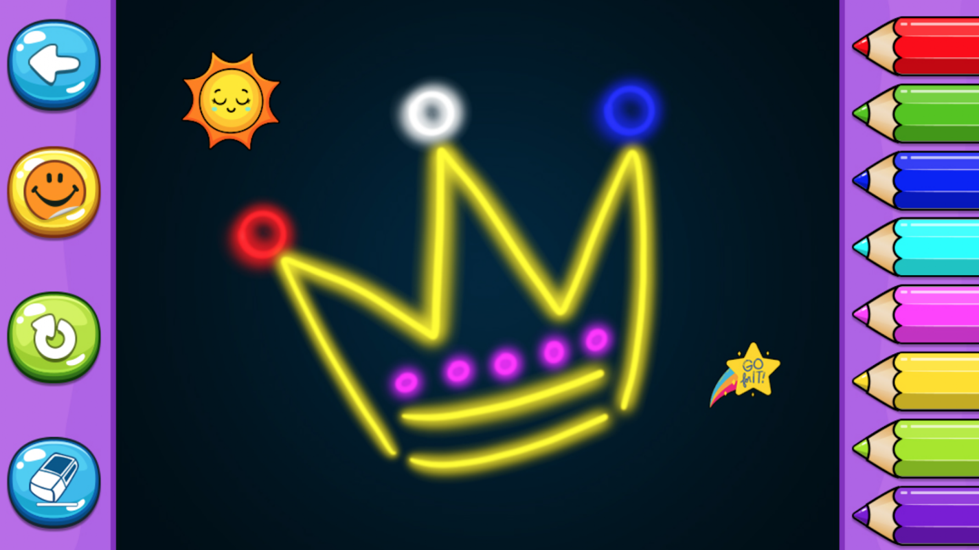 最高に楽しくて光る、お子様向けのお絵かきアプリ!幼いアーティストのために特別に設計されたこの魔法のお絵かきボードは、画面を光るキャンバスに変え、ネオンライト、光る色、そして魔法のような効果でお子様がお絵かきできます。